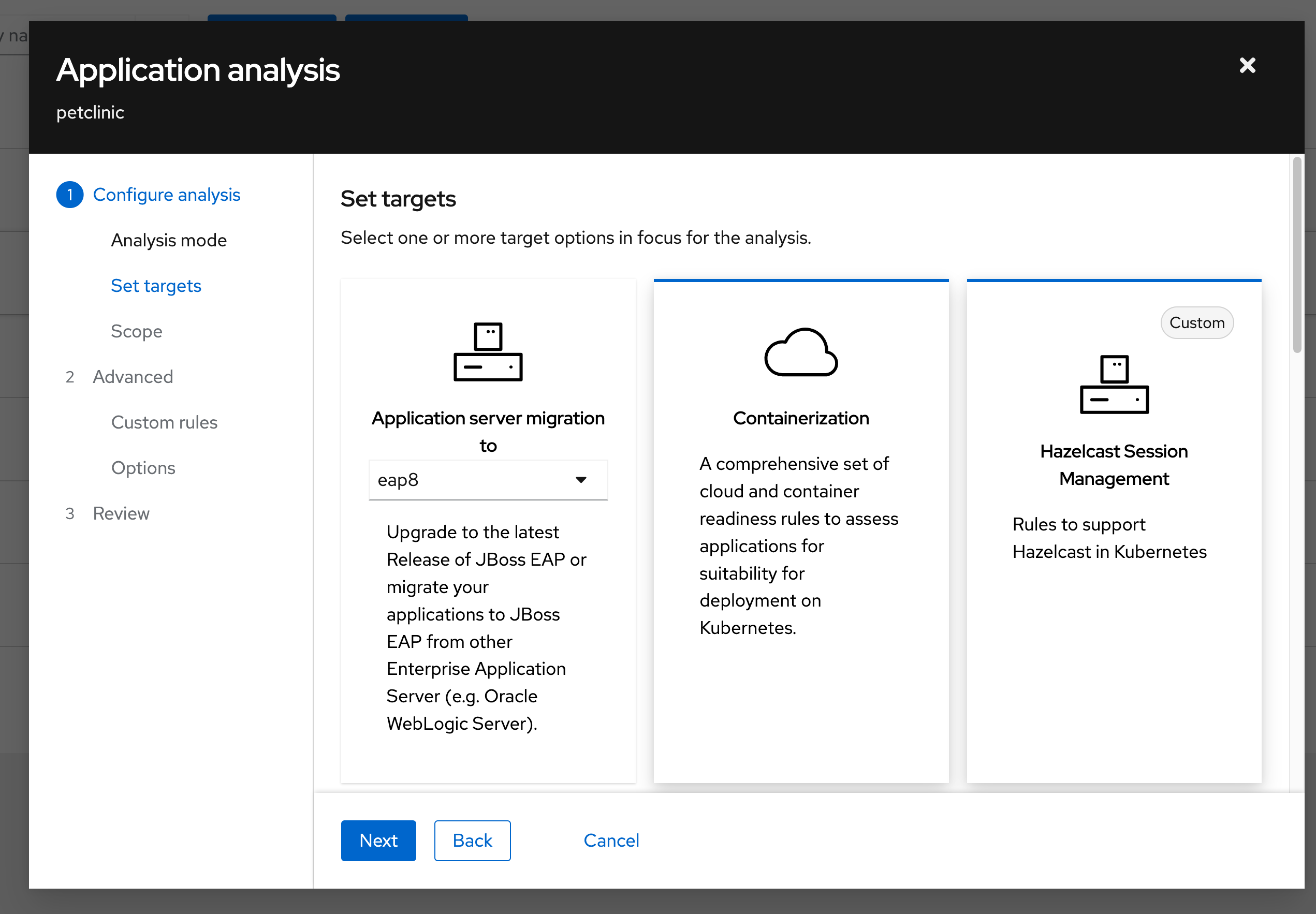 Set Targetspane, selectContainerizationas well as ‘Hazelcast Session Management’ options and clickNext
