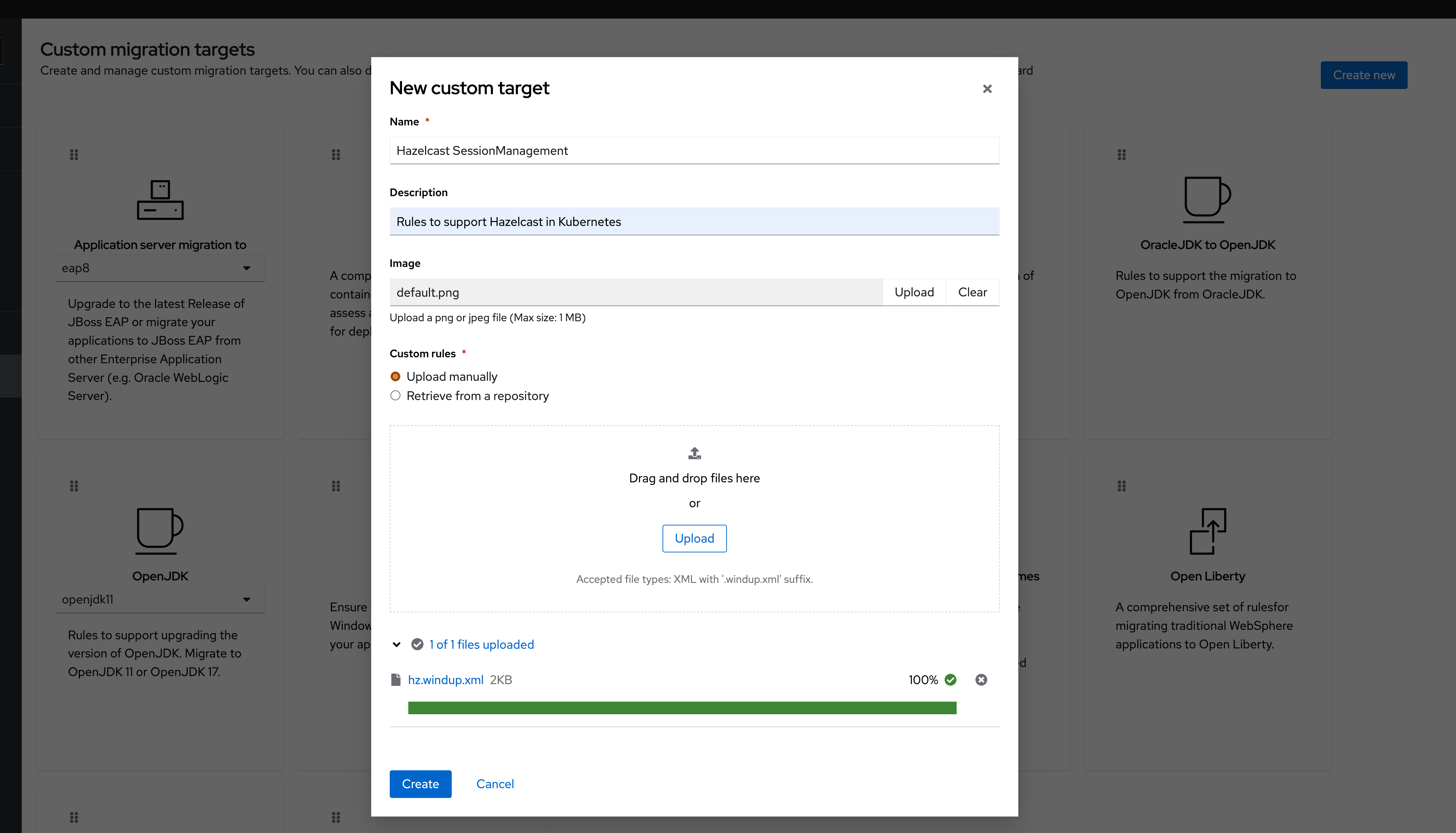 - Download the custom rule from here and save it with an extension ‘.windup.xml’. Upload the file to the wizard and click on create button.